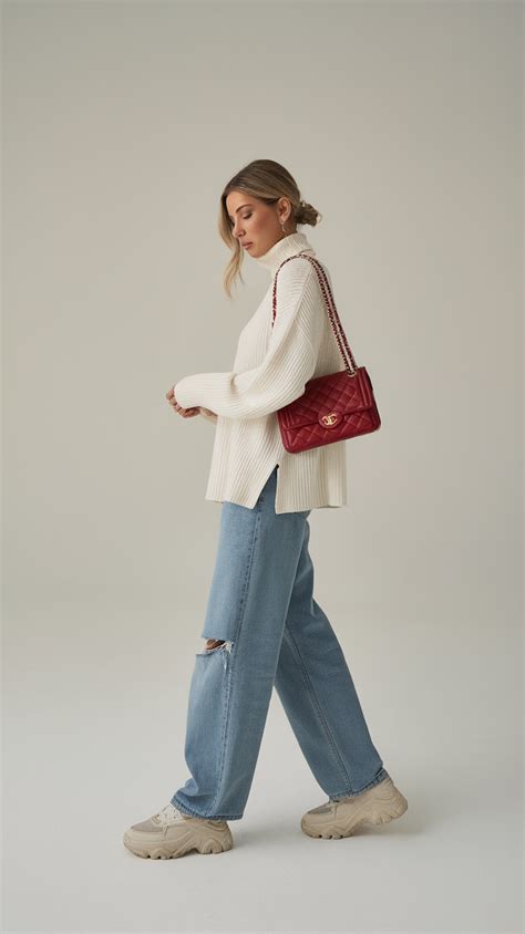 Denim is a timeless fabric that can be styled in a multitude of ways. For a casual yet trendy look, pair a pair of ripped jeans with a neutral top and a sleek red bag. The edgy denim will contrast beautifully with the vibrant red, resulting in an effortless and street-style-inspired ensemble.