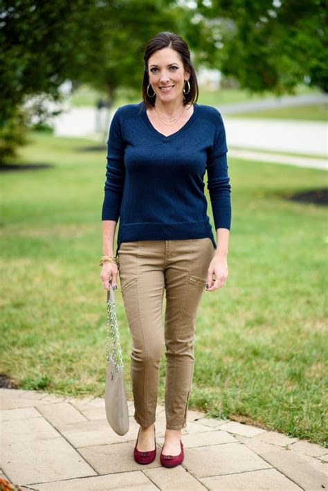 For a professional yet stylish workday, opt for tailored khaki pants paired with a crisp white blouse. Accessorize with a statement necklace and sleek pumps for a polished finish. Alternatively, try a khaki pencil skirt with a vibrant sweater and pointed-toe flats.