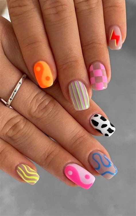 Embrace the energy of summer with neon-bright nails. These vibrant shades, like electric blue, fiery orange, and dazzling pink, are guaranteed to turn heads. Whether you choose to paint them all one color or create a multi-hued masterpiece, neon nails are the perfect way to make a statement.