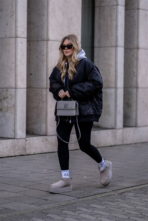 For a laid-back and effortlessly cool look, team your Ugg Mini Platforms with a pair of joggers and a cozy hoodie. The combination of soft materials and relaxed silhouettes will keep you warm and comfortable all day long. Add a beanie and a stylish puffer jacket to complete the street-style vibe.
